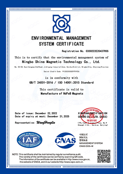 Ningbo Shine Magnetic Technology Co.,Ltd.está em conformidade com a ISO 14001:2015 para fabricação de ímãs NdFeB